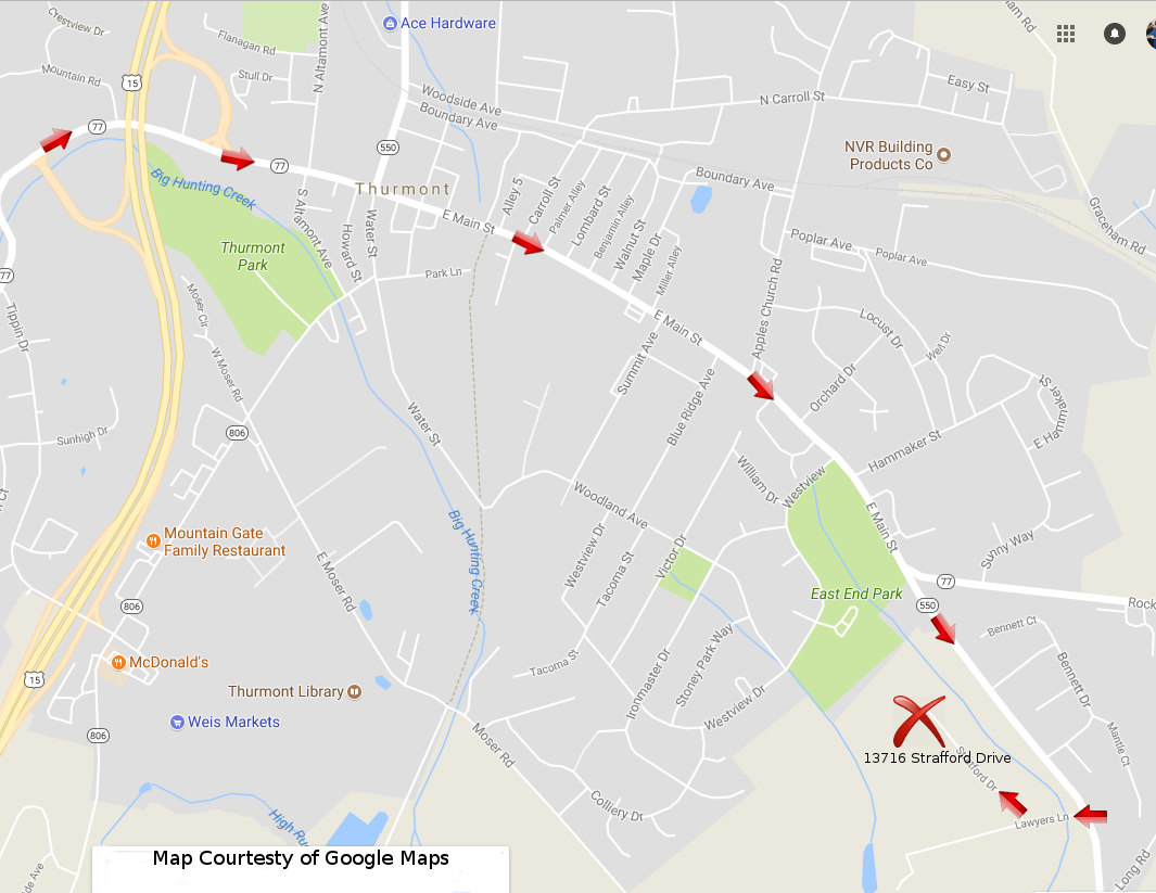 Follow US-15 S to MD-77 E/W Main St in Thurmont. Take the MD-77 exit from US-15 S